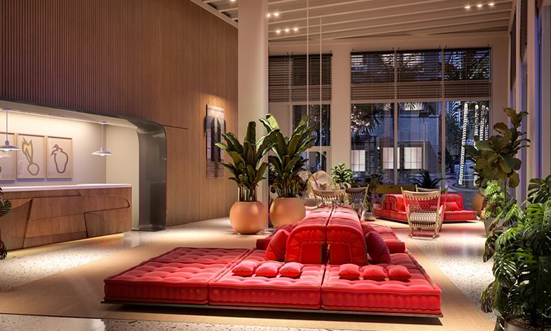 - Lobby espacioso de doble altura, café, espacios sociales personalizados.